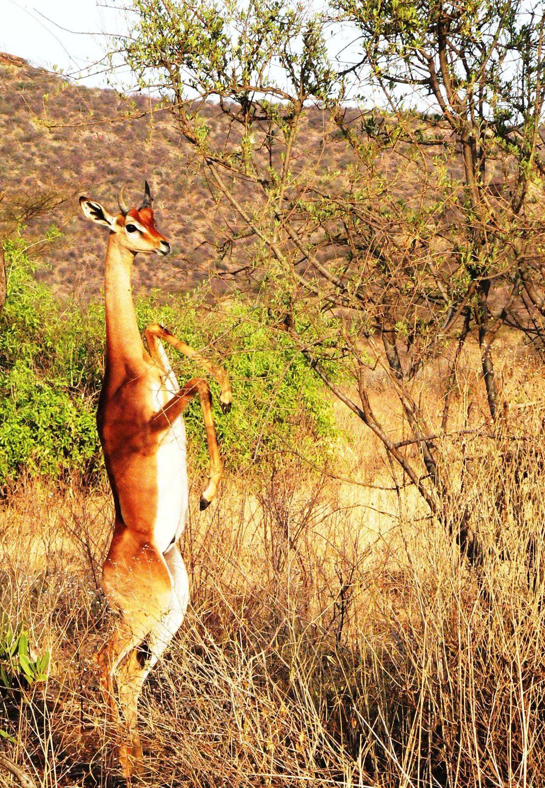 5. The gerenuk, also known as the Waller’s gazelle, is a long-necked species of antelope found in dry thorn bush scrub and desert in Eastern Africa. The word gerenuk comes from the Somali language, meaning “giraffe-necked”.Gerenuks have a relatively small head for their body, but their eyes and ears are proportionately large.Gerenuks seldom graze but browse on prickly bushes and trees, such as acacias. They can reach higher branches and twigs than other gazelles and antelope by standing erect on their rear legs and stretching their elongated necks.