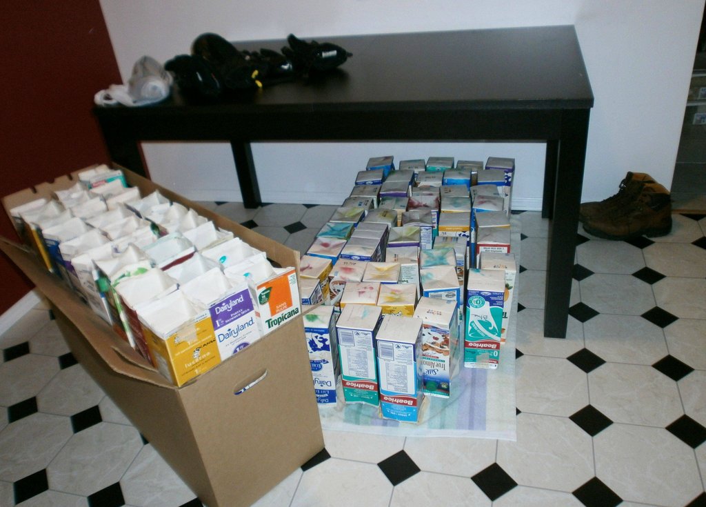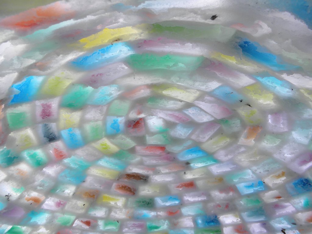 Then the first layer of ice blocks, built from milk cartons they collected, added coloring to, and froze.