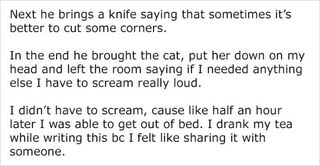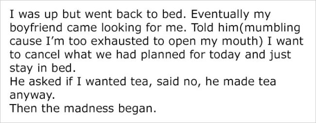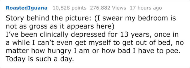 Imgur user RoastedIguana is clinically depressed herself, and recently had a really bad day in which she couldn’t bring herself to leave her bed, even for a quick trip to the bathroom. While it must be very difficult for her boyfriend to see her that way, his silly response couldn’t have been better.