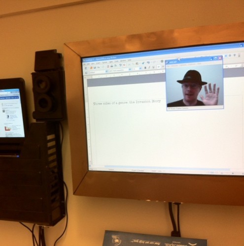 He uses his new-and-improved Nerd Office to write novels and stories like these ones.