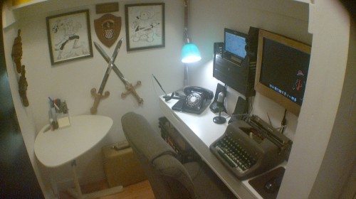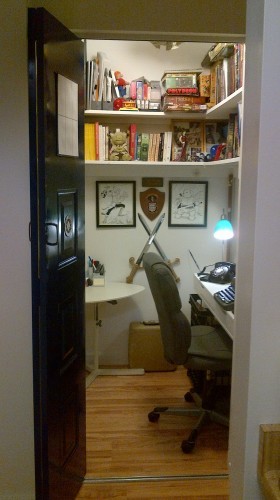 The author decided to put a small desk and a chair in the closet, along with his computer and typewriter. Not bad. A little cramped.