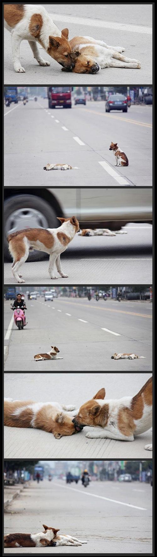 When people say that animals don’t have feelings, the only thing I can say is that these people have never been in contact with an animal. Spending just a few minutes with one and you can see their personalities, their emotions, and even sometimes their attitude. So when I saw what happened after one stray dog’s best friend was struck by a car, it didn’t surprise me – but it still broke my heart knowing the pain this doggy is feeling.The photos say it all.