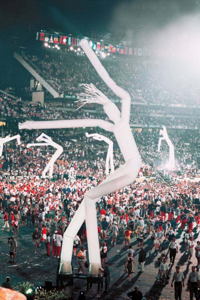 Minshall’s “tall boys” dancing at the 1996 Olympics in Atlanta. Unlike their descendants, these tube men have two feet instead of a single stem.