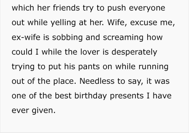 Scroll down and read all about how this scorned husband gave his soon-to-be ex-wife what he calls “one of the best birthday presents I have ever given.”