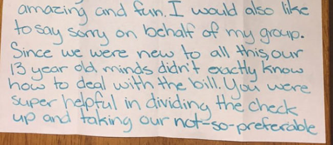 So I wanted to say thank you for making our “grown up” experience so amazing and fun. I would also like to say sorry on behalf of my group. Since we were new to this, our 13 year old minds didn’t exactly know how to deal with the bill. You were super helpful in dividing the check up and taking our not-so-preferable cash. The bill was reasonable, but we had completely forgotten (and frankly didn’t know) what a tip even was, let alone how much to give.