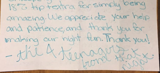 The standard rule is 15-20 percent of the pre-tax bill. One waiter was recently surprised when he was just left a small fraction of that after a pleasant experience with four teens. What he couldn’t have anticipated what came soon after.